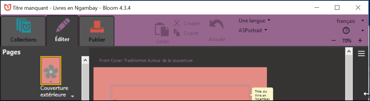 It opens on the Outer cover page.infoNote that the book appears in the Edit tab. The left pane is called Pages. It shows the pages that are in your book. The highlighted page in the Pages pane is displayed in the centre.