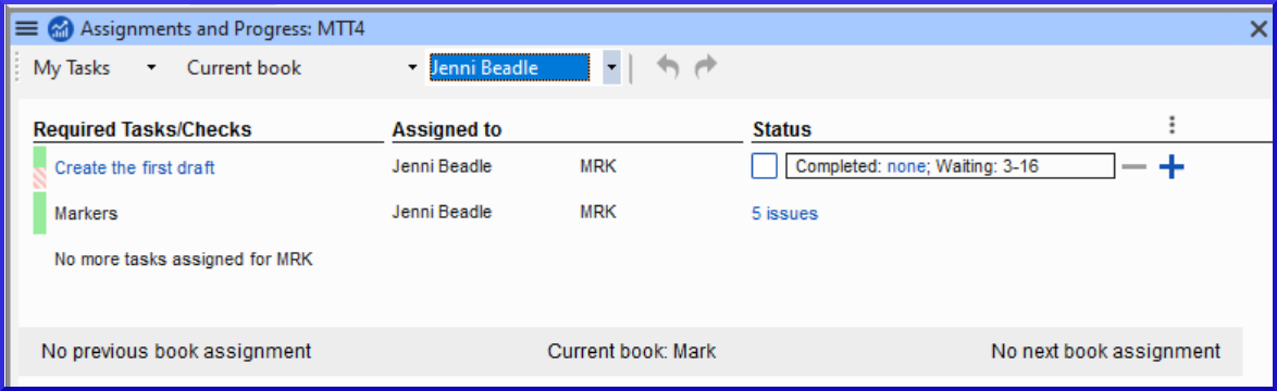What are we going to do? You will mark a variety of tasks as complete. The exact steps will vary slightly depending on whether the task is set to once per project, once per book, or by chapter. The place to mark progress for all types of tasks is the Status column.