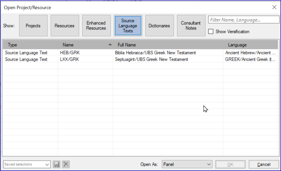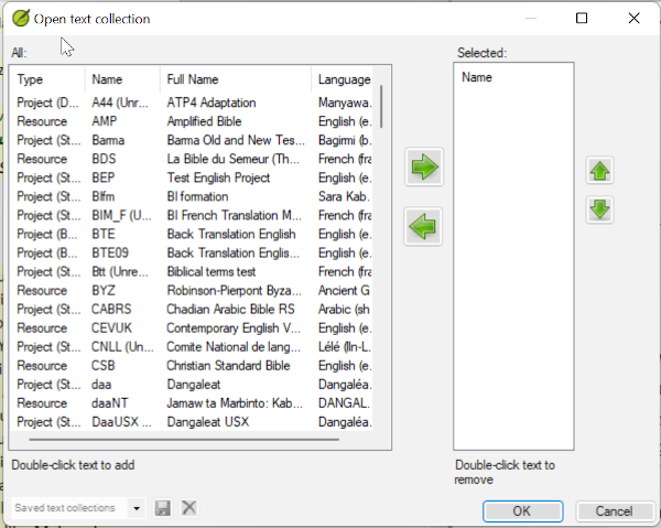 - ≡ Paratext menu, under (Paratext > Open, select several resources, choose to open as Text collection. See 2.5)