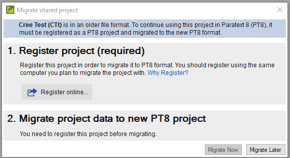 Migration is the process of moving a project (including all settings files) from Paratext 7 to Paratext 8 (and then opened in Paratext 9). Paratext 8 projects can be read in Paratext 9 without migration. since Paratext 9 does not have a migration feature, any remaining Paratext 7 projects will need to be migrated to Paratext 8 first.