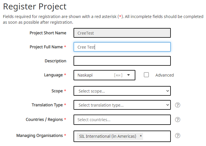 - Click the “**Advanced**” box to fill in more information if you need to distinguish the language of your project from the language with that Ethnologue code.