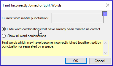 Find incorrectly joined or split words In the Wordlist (≡ Tab, under Tools – Wordlist)