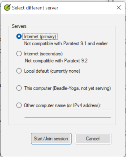 Paratext 9.3 allows you to choose a server. Everyone in a particular live session still needs to use the same server (either Primary or Secondary), it is just that from 9.3 you can work with someone on 9.1 or someone else on 9.2 (just not at the same time.)